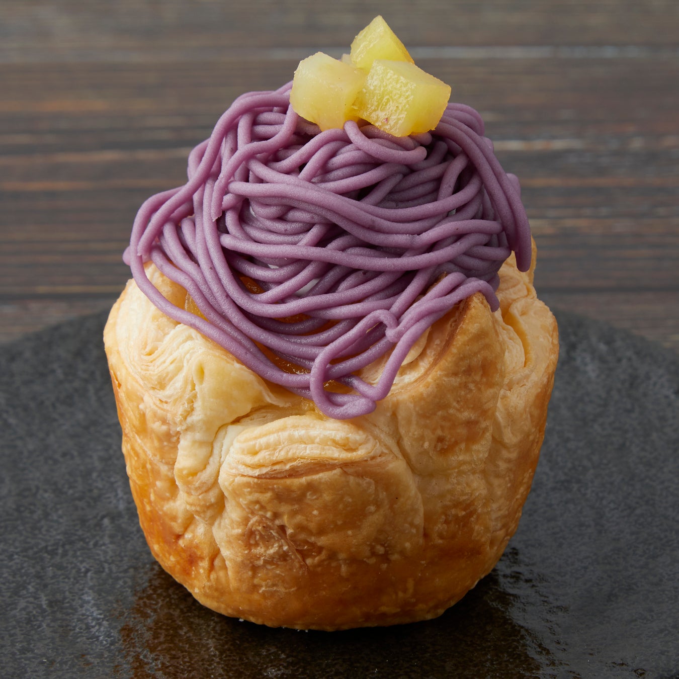 色鮮やかな紫芋が目を惹く、秋にぴったりな逸品の登場! ジューシーな国産りんごと、ほろほろと口どけるパイ生地、モンブラン仕立ての優しい甘みの紫芋クリームが織りなすマリアージュをお楽しみいただけます。王冠を思わせるカタチで、小ぶりなのに手に取ると“ずっしり感”があり、手土産や自分へのご褒美におすすめ。