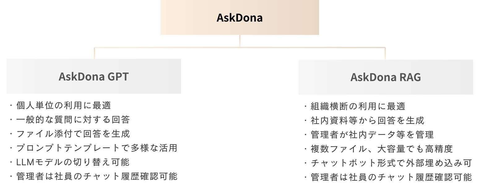 AskDonaは、企業の生成AI活用における課題を解決するプラットフォームです。ChatGPTなどのLLMを安全かつ効果的に業務に取り入れられるよう、「AskDona GPT」と「AskDona RAG」の2つのサービスを提供しています。AskDona GPTは、セキュリティに配慮した法人向けのChatGPT環境を提供し、AskDona RAGは、企業独自のデータを追加学習させることで、より精度の高いAI活用を実現します。目的に合わせて最適なサービスをご利用いただけます。