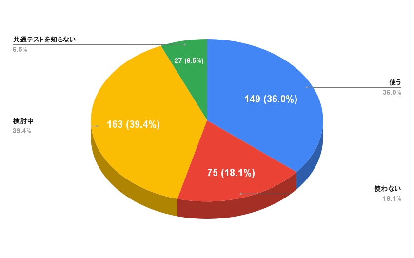 共通テストの利用については、「検討中」が最も多く、全体の約40%を占めているものの、次いで回答が多かった「使う」とほぼ拮抗する形になりました。その一方、「使わない」と回答した人は全体の約2割弱にとどまっています。このことから、適宜受験の必要性を見極めつつも多くの人が共通テストの活用を考えていることがうかがえます。