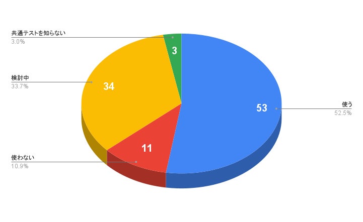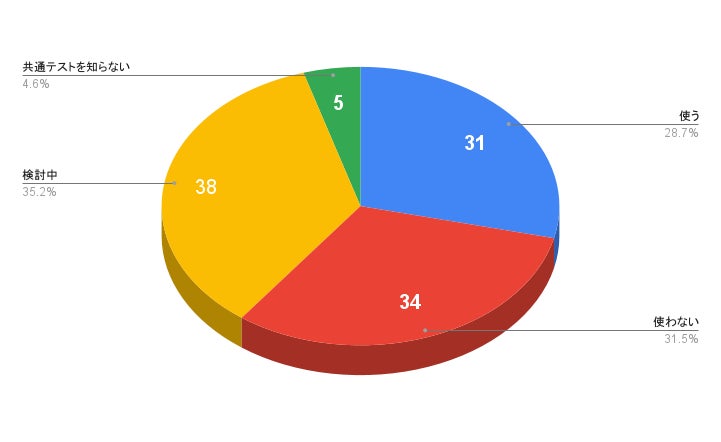 文系では「使う」と回答した人が28%と理系に比べて少ない一方、「使わない」と回答した人が理系の3倍ほどの割合を占めています。「検討中」が理系や全体の割合と大きく変わらないことを踏まえると、文系選択者は、共通テストの利用を必要としない受験形式を検討している人も多いと言えます。