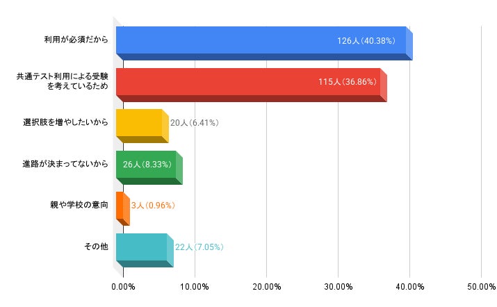 共通テストを受験する理由として多かったものは、「(志望校の受験に)利用が必須だから」「共通テスト利用を受験するため」の二つです。