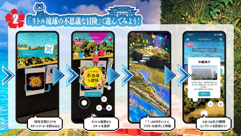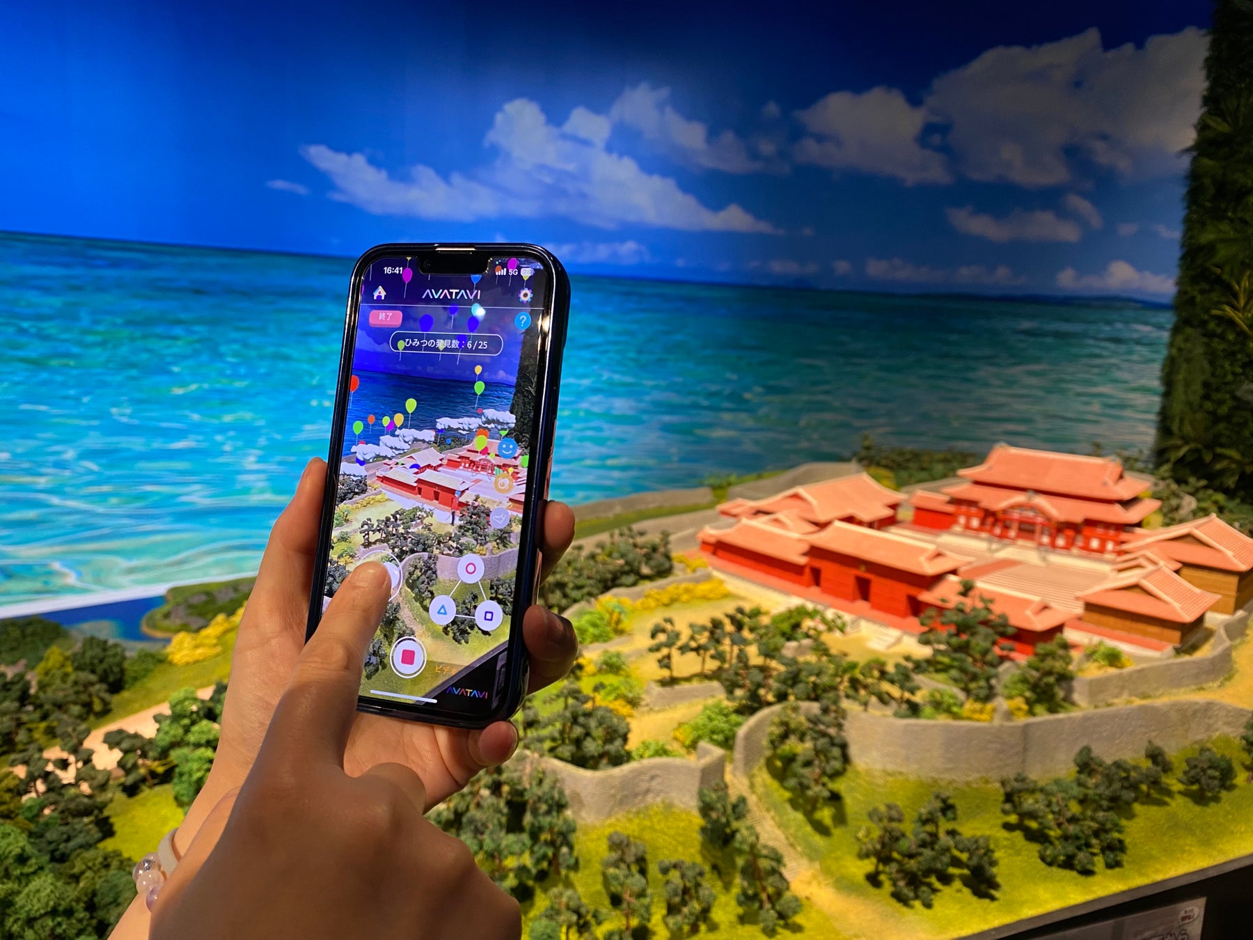 舞台は首里城を中心とした琉球王国のミニチュアで、スマートフォンを通しARとして登場させた自身のアバターを操作して遊びます。