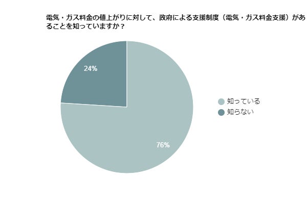 電気・ガス料金の値上がりに対して、76%が政府による支援制度があることを「知っている」