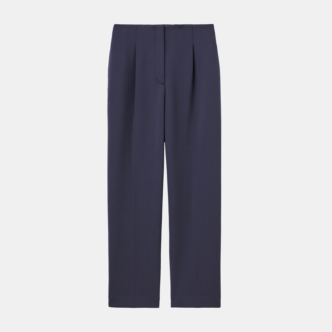 「スキューバジャージーテーパードパンツ」は、ジャージー素材による動きやすさだけではなく、美脚にもこだわったデザインのパンツです。前身頃のタックから繋がったセンタープレスで縦のラインが強調されて脚長効果に。また、ちょうどウエスト位置にくる股上の深さも腰回りをすっきり見せてくれます。