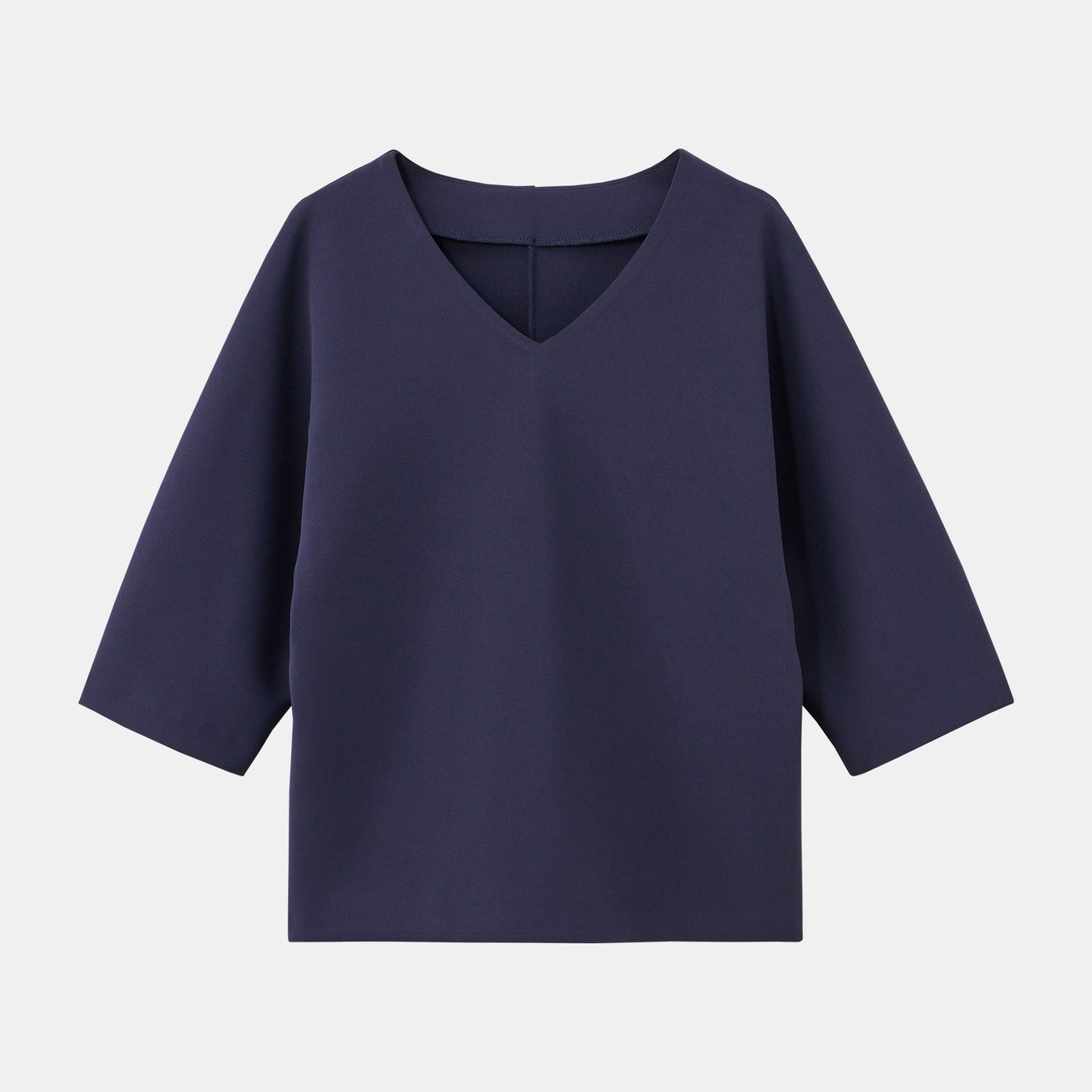 袖と前身頃のつなぎ目がなく、ゆったりとしたシルエットの「スキューバジャージードルマンプルオーバー」は、高い伸縮性のあるジャージー素材でつくることで、体を包み込むような着心地に。首元を美しく見せる浅めのVネックは、ノンステッチ仕様にすることで上品さを演出しています。