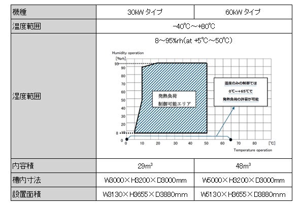 今回発売するウォークインチャンバーはAIサーバー稼働時を想定した発熱負荷(30kW、60kW)に対して、独自の制御システムにより精密に温湿度制御を行い、サーバーの信頼性評価に関する試験規格ASHRAEに適合した試験を実施することが可能です。また、新たに採用した空気循環方式により、AIサーバーの排熱による試験への影響を低減し、試験室内の均一な温湿度環境を実現すると共に、槽内の排熱が室内に滞留することなく効率良く試験を行うことが可能です。さらに、新たに開発した空調システムを搭載し、装置の消費電力を抑えると共に、省スペース化を実現しました。本製品により、発熱量の高い高性能半導体や電源を搭載するAIサーバーの信頼性確保に貢献します。
