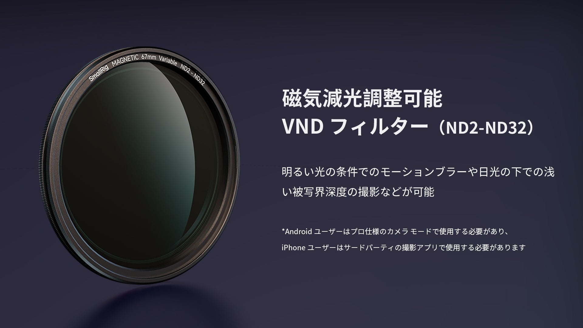 磁気減光調整可能VNDフィルターを使用すれば、明るい光の条件でのモーションブラーや日光の下での浅い被写界深度の撮影などが可能になります。ND2、ND32の回転式ハードストップデサイーにより、撮影をより正確にコントロールできます。