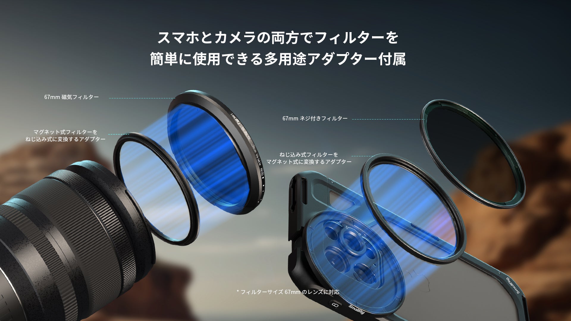 スマホとカメラの両方でフィルターを簡単に使用できるアダプターも用意します。