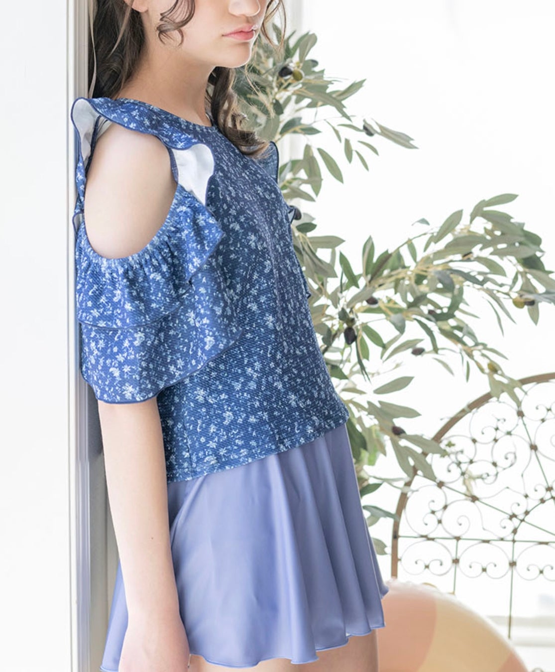 タンクトップの形をベースに肩あきフリル袖をつけた、ちょっぴり大人っぽい表情が魅力のデザイン水着です。ワッフル生地のデザイントップスは、普段着感覚で着られる気安さとかわいらしさを兼ね備えています。水着より抵抗なく気軽に、普段着よりちょっと大胆におしゃれを楽しめるこの水着で、プールやビーチへのお出かけを満喫してください。