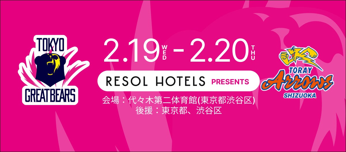 リソル株式会社(所在地:千葉県茂原市、代表取締役社長:佐野直人)が運営するツーリストホテル「リソルホテルズ」では、2024-25 大同生命 SV.LEAGUE MEN 東京グレートベアーズ ホームゲーム 東レアローズ静岡戦(日時:2025年2月19日(水)・20日(木)、会場:国立代々木競技場第二体育館)において、マッチデースポンサーとして協賛し、「RESOL HOTELS DAY」を開催することとなりましたのでお知らせいたします。