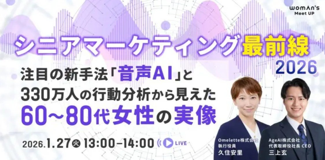 Omelette株式会社(東京都港区、代表取締役 羽野仁彦)は、運営するWEBサイト「シニアマーケティングDX」にて、woman’s主催の無料オンラインセミナー 「注目の新手法「音声AI」と330万人の行動分析から見えた60〜80代女性の実像」の開催を発表いたします。