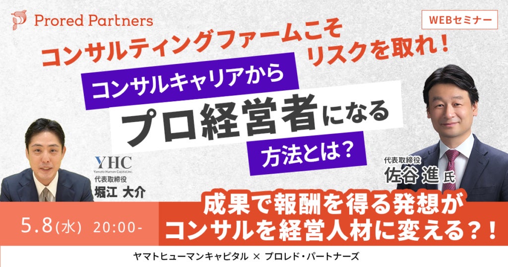 ヤマトヒューマンキャピタル株式会社(本社:東京都千代田区、代表取締役:堀江 大介)は2024年5月8日(水) 20:00よりオンラインにて、株式会社プロレド・パートナーズ代表取締役の佐谷氏にご登壇いただき、ウェビナー『コンサルキャリアからプロ経営者になる方法とは?』を開催いたします。
