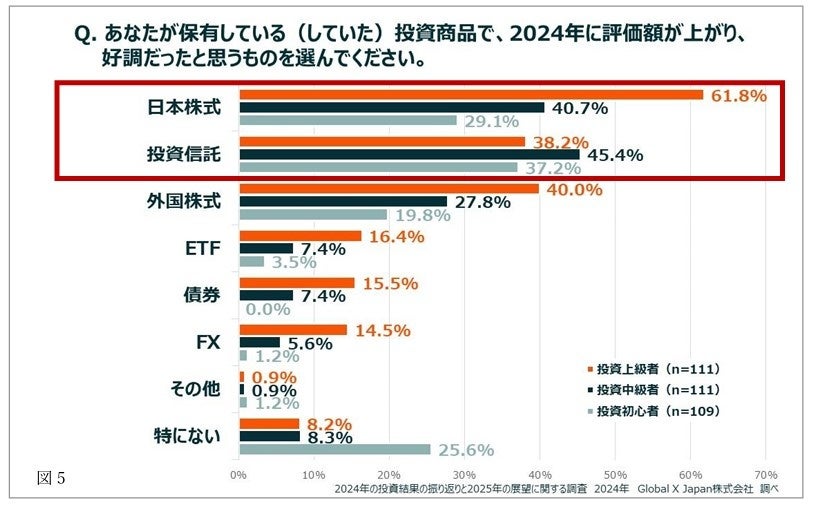 2024年に保有した投資商品の中で好調だったものとして、投資上級者からは「日本株式」が、投