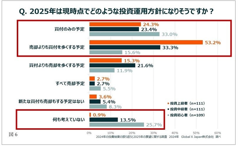 2025年の投資方針については、投資上級者は「買付のみの予定」「売却よりも買付を多くする予定」を選んだ人が約8割、中級者は約6割、初心者は約5割となり、全体的に来年も引き続き買付志向
