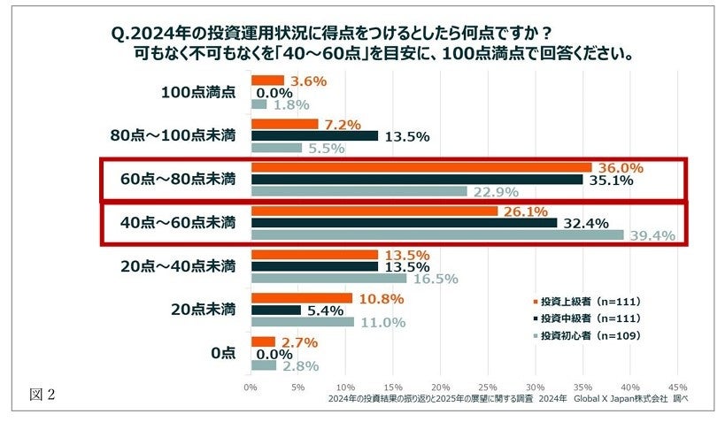 2024年の投資運用状況の自己採点は、投資中・上級者はやや高評価となる「60点~80点未満」を