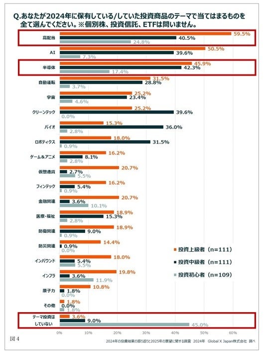 • 2024年に保有した投資商品のテーマ、人気は「高配当」「半導体」。