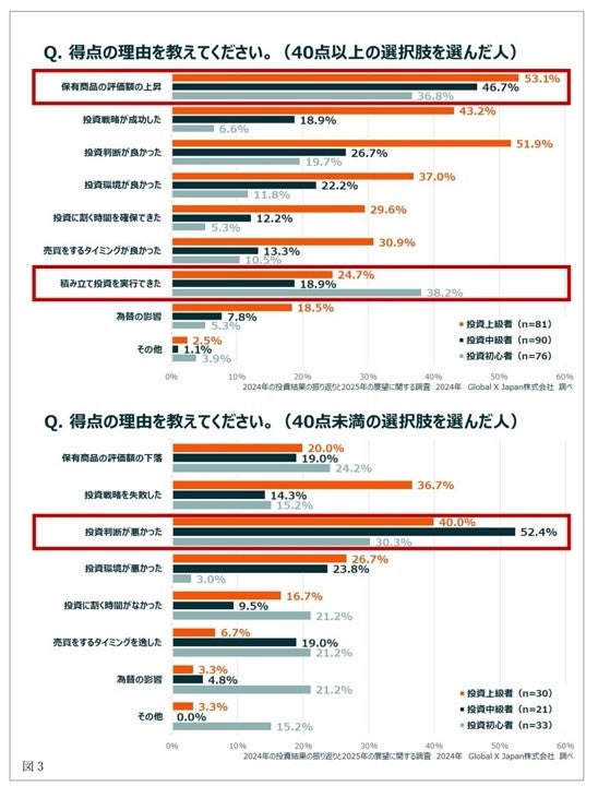 一方、低評価となる40点未満と回答した人は投資経験を問わず「投資判断が悪かった」の回答が