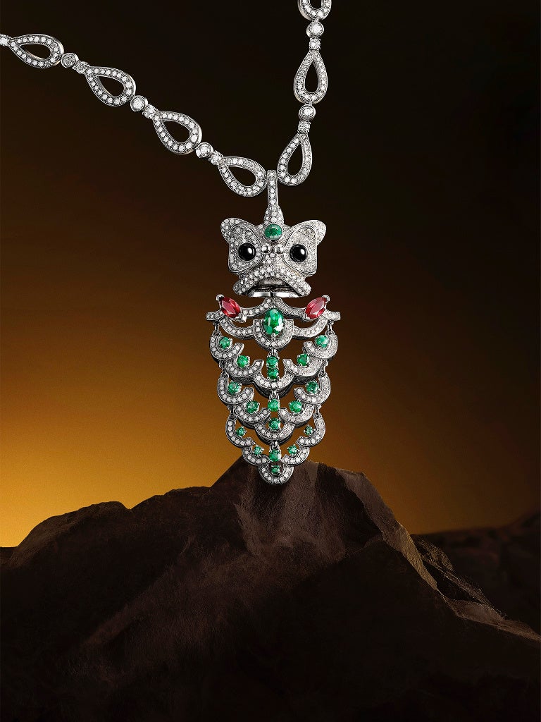 最初のセットは、18Kホワイトゴールドにダイヤモンド、エメラルド、ルビーをあしらったデザイン。中央に配されたオーバルカットのエメラルドは、獅子に気品ある存在感を与え、格別な輝きを放ちます。Qeelinならではの職人技により、獅子の口が開き、身体がしなやかに揺れ動くと、あしらわれた貴石が光を受けてきらめき、生き生きとした祝福の舞を演出します。