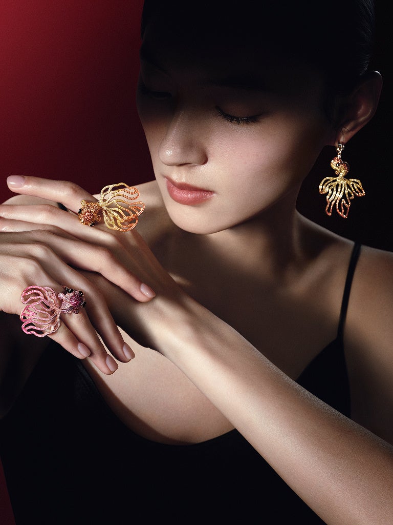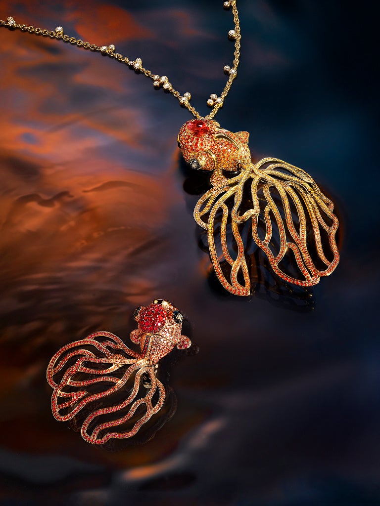 再解釈された "Qin Qin" ファインジュエリーコレクションは、金魚のシルエットを、オレンジとイエローのサファイアがグラデーションで輝く18Kイエローゴールド、ピンクサファイアとルビーをあしらった18Kローズゴールド、そしてダイヤモンドをあしらった18Kローズゴールドで表現。それぞれの額には、特注のカボションカットのルベライトが輝きを添えます。