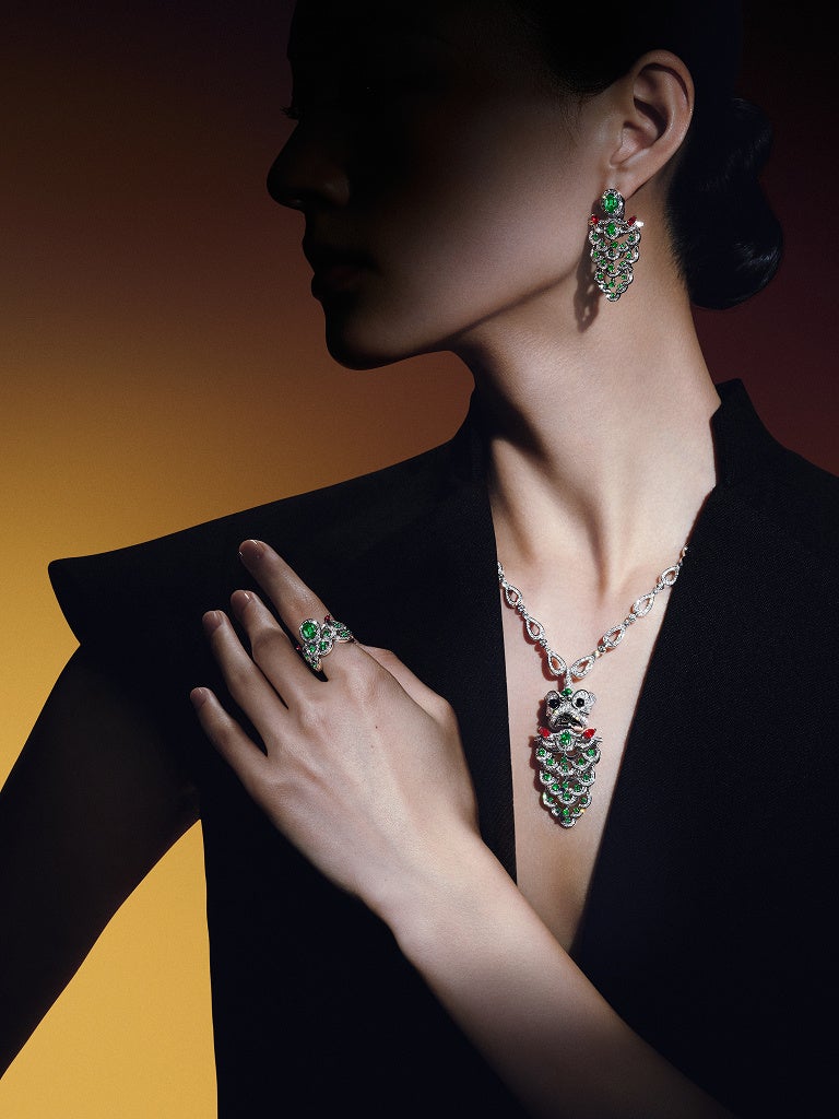 【左】: Qeelin Xi Xi ファインジュエリーコレクション ネックレス(18K WG × EM 計約1.48ct[内1石 オーバルカット 約0.38ct含む]、RU 0.80ct、ONX 2ピース、DIA 7.67ct) Qeelin Xi Xi ファインジュエリーコレクション イヤリング(18K WG × EM 計約2.26ct[内4石 オーバルカット 約1.50ct含む]、RU 0.60ct、DIA 0.96ct) Qeelin Xi Xi ファインジュエリーコレクション リング(18K WG × EM 計1.60ct[内1石 ザンビア産ヴィヴィッドグリーン オーバルカット 1.07ct含む]、RU 0.27ct、DIA 0.46ct)※文中の表記は、EM=エメラルド、RU=ルビー、ONX=オニキス、DIA=ダイヤモンド、WG=ホワイトゴールドを表します。