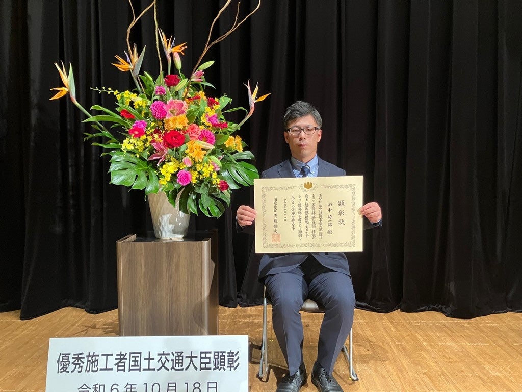 2024年10月18日に東京・有楽町よみうりホールにて令和6年度『優秀施工者国土交通大臣顕彰』(通称:建設マスター)と『青年優秀施工者不動産・建設経済局長顕彰』(通称:建設ジュニアマスター)が行われ、当社社員の田中功一郎が建設マスター、池田俊浩が建設ジュニアマスターの称号を受け、顕彰を受けました。