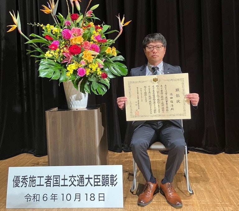 この度は、令和6年度優秀施行者国土交通大臣顕彰を受賞させて頂き誠にありがとうございました。これまで熱心に指導して頂きました社員の方々、関係各所の皆様のおかげであり感謝申し上げます。建設マスターとして安全に品質の良いものを施工することを心掛け、これからも建設業界の発展のため、後進の育成にも努めていきたいと思います。