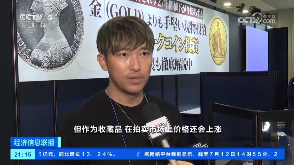 葉山満は「コイン投資の鬼」として、YouTubeやSNSを通じてアンティークコインの魅力を発信しており、今回のイベントでも多数のメディアが注目。中国においても、アンティークコインへの関心は年々高まっており、特に「中国コイン」の価値上昇が注目されています。この状況を背景に、中国国営放送CCTV(中国中央電視台)からの取材依頼を受け、葉山はアンティークコイン投資の魅力を詳しく語りました。このインタビューは中国全土で放映され、この放映を通じてアンティークコインが世界中で注目される資産であることを、改めて広く認知していただく機会となりました。