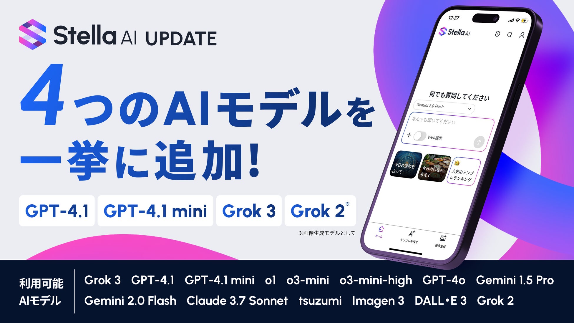 生成AIを活用したサービス開発に取り組む株式会社SUPERNOVA(本社:東京都港区 代表取締役社長 木本 東賢 以下、当社)は、「Stella AI🄬」でご利用いただけるAIモデルにxAI社のテキスト生成AIモデル「Grok 3」および画像生成AIモデル「Grok 2」、OpenAI社のテキスト生成AIモデル「GPT-4.1」「GPT-4.1 mini」を2025年4月16日(水)から追加します。※