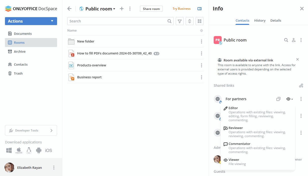 ルーム内では、DocSpaceオーナーとDocSpace管理者が、招待されたルームに応じて、それぞれの役割に応じた操作のみが可能になりました。