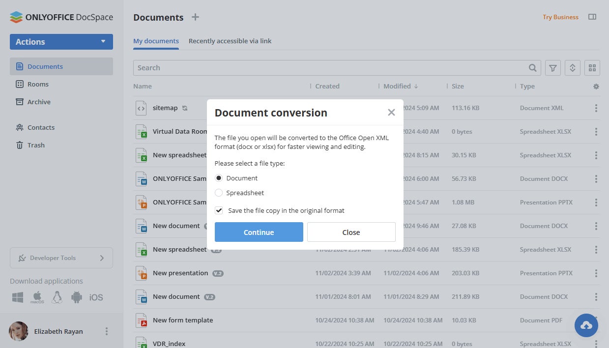 GDPRに準拠したオフィススイートは、テキスト文書、スプレッドシート、プレゼンテーション、フォーム、PDFのためのウェブベースのエディターで構成されており、OOXMLファイルとの完全な互換性を提供します。編集機能として、リアルタイムおよびパラグラフロックによる共同編集モード、コメントとレビュー、内蔵チャット、バージョン履歴を備えています。