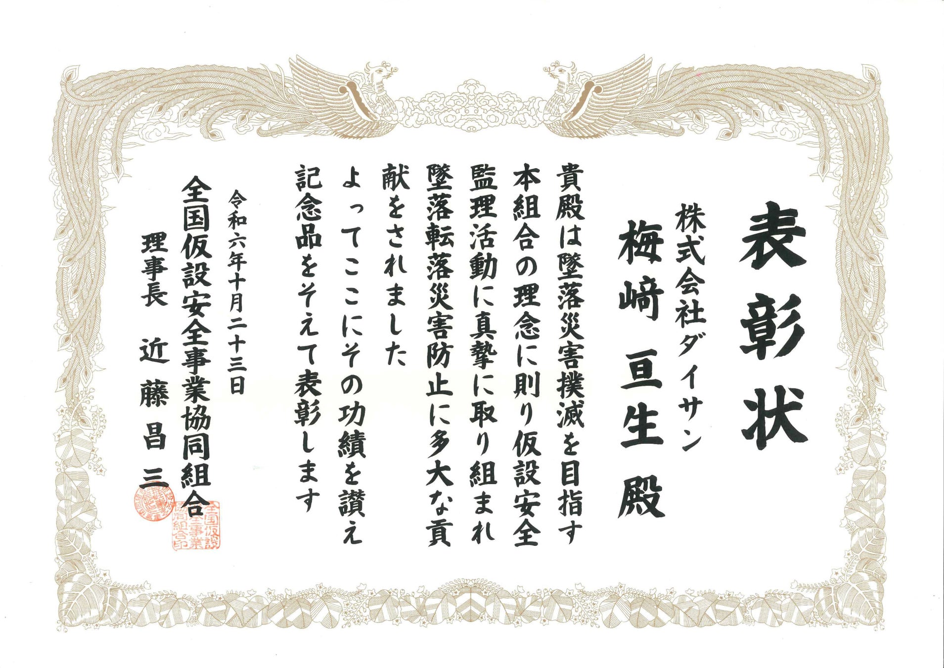 2024年10月23日に建築会館(東京都港区)にて開催された全国仮設安全事業協同組合の安全見える化大会において、株式会社ダイサン(代表取締役社長:藤田武敏)社員の梅崎亘生が、仮設安全監理活動の取り組みを通じ、墜落転落災害防止に貢献したことが認められ、功労者表彰を受賞いたしました。