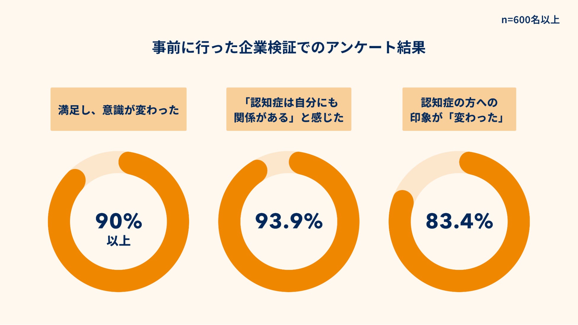 ◦ このセミナーの開発にあたって行った企業向けの検証では、合計600名以上の方にご参加いただき、90%以上の方が満足し、意識が変わったと回答しました。特に、93.9%の参加者が「認知症は自分にも関係がある」と感じ、83.4%の方が認知症の方への印象が「変わった」と答えています。