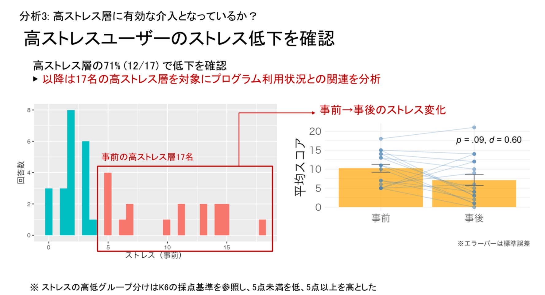 2. 高ストレス層の71%(17名中12名)で改善を確認 事前調査で高ストレス群だった層の多くが、利用後にストレス値の減少を示しました。
