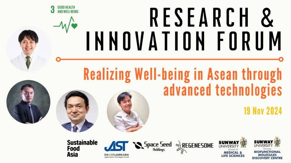 スペースシードホールディングス(本社:東京都港区、代表取締役:鈴木健吾、以下「スペースシードホールディングス」)は、子会社であるリジェネソーム株式会社を代表して、2024年11月19日にマレーシアのサンウェイ大学で開催された「Innovate for Longevity: Health and Wellness Challenge」のフォーラムに参加しました。このフォーラムは、ASEAN地域が直面する健康や福祉の課題に対応する最先端技術ソリューションを紹介することを目的として開催されたものです。