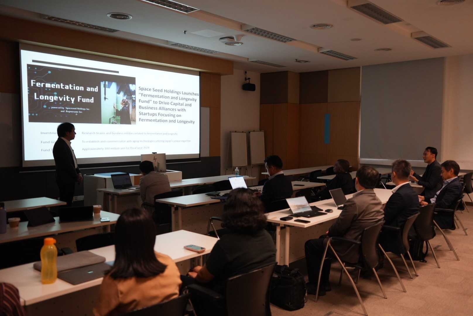 またDr. Kengo は、津南醸造と一緒に開発しているα-EGを豊富に含む酒や、日本酒製造プロセスで得られるナノ粒子のSAKESOME、微細藻類由来成分であるフコキサンチンやバタフライピーを活用したヘルスケアへの応用といった、既存製品と有望な素材についても言及しました。これらは、分子生物学や発酵技術を最前線で活用すると同時に、持続可能性にも配慮した事業展開が可能であることも説明しました。また、スペースシードホールディングスが立ち上げた「発酵とロンジェビティ基金」も紹介されました。この基金は18か月以内に概念実証が可能なスタートアップに関連するプロジェクトを支援することを目的としており、革新的な研究の社会実装をサポートする方針を打ち出しています。