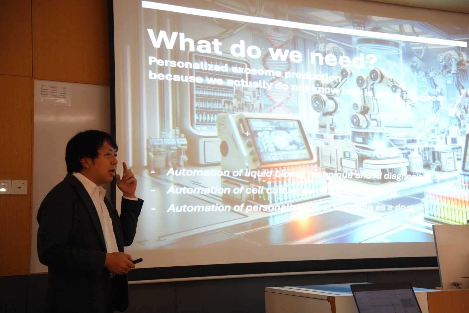 プレゼンテーションでは、リジェネソームが進めるエクソソームを活用した未来の治療法のビジョンを紹介しました。このエクソソーム療法はロンジェビティ科学における有望なフロンティアであり、現在開発中の「高度なエクソソームソーター」の概念も共有されました。この技術が実現すれば、治療用エクソソームの品質、スケーラビリティが大幅に向上し、加齢関連疾患に対するより効果的で個別化された治療が可能になると期待されています。