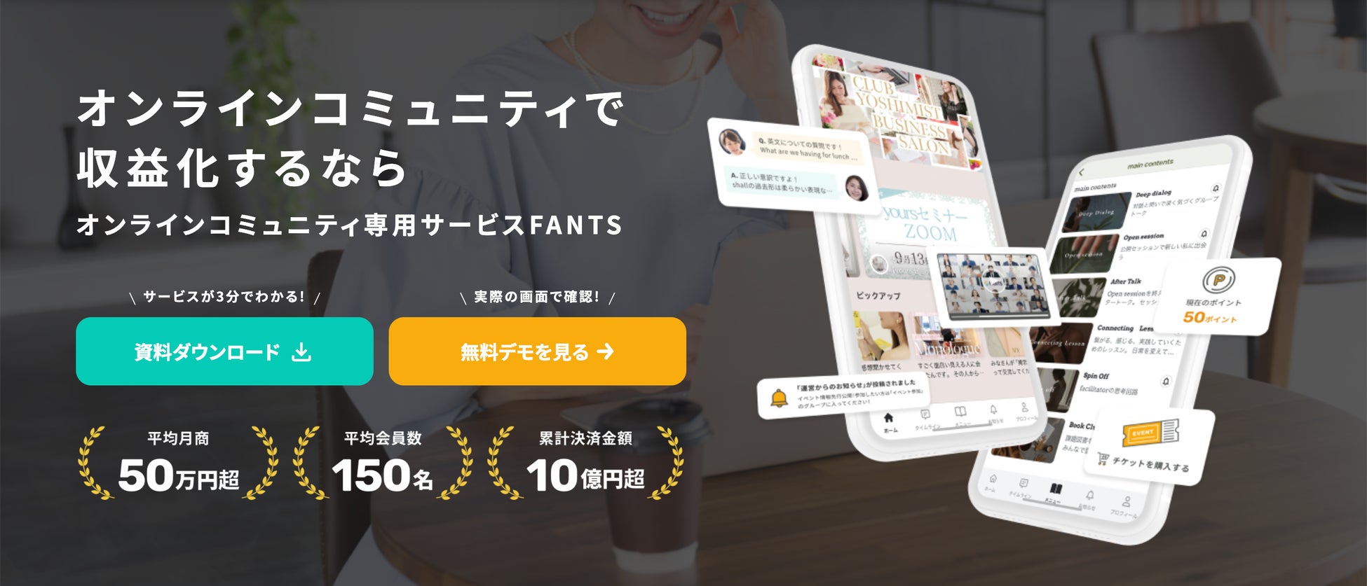 FANTS(ファンツ)は、オンラインコミュニティの成功支えるプラットフォームで、今まで300サロン以上の実績とノウハウを活かしてオンラインコミュニティ開設をサポートさせていただいております。持続的な収益拡大を目的としたコミュニティを創りたいのならお気軽にご相談くださいませ。