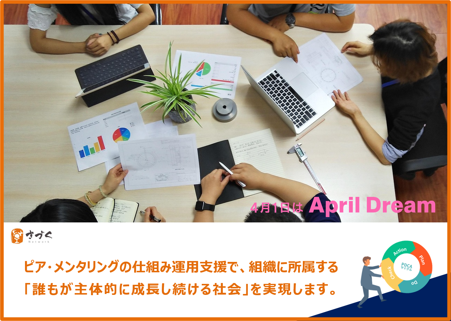 私たちの夢は、あらゆる企業や団体でピア・メンタリングが浸透し、成長・育成が当たり前、「誰もが主体的に成長し続ける社会」を実現することです。