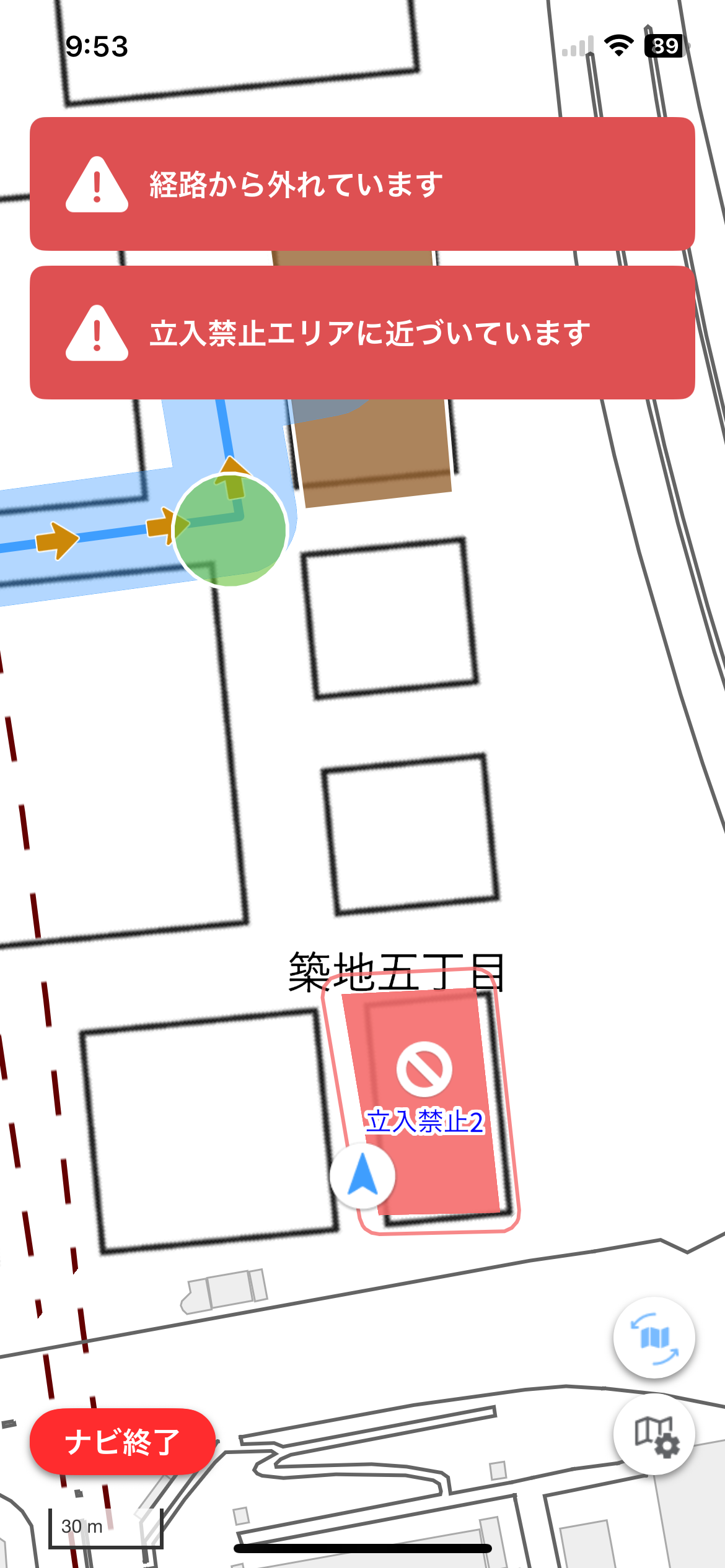 ナビゲーション中に設定ルートから外れると、即座に警告を表示します。これにより、危険区域への誤進入を防ぎ、構内交通の安全を確保できます。現場職員は来場中のユーザーの位置を把握することができます。この機能は現場職員の監視・誘導負担の軽減にも寄与します。