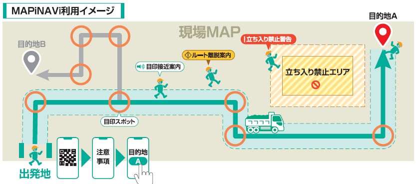 本アプリは、建設現場や造成地、山間部、仮設・未供用道路、大規模工場など、一般的な地図データに収録されていないエリアにおいても、図面を重ね合わせたオリジナルマップを活用することで、スムーズなナビゲーションを実現するものです。稼働中の現場で実証実験を行い、市販のナビに対応しない場所でもアプリが適切に動作することを確認しました。