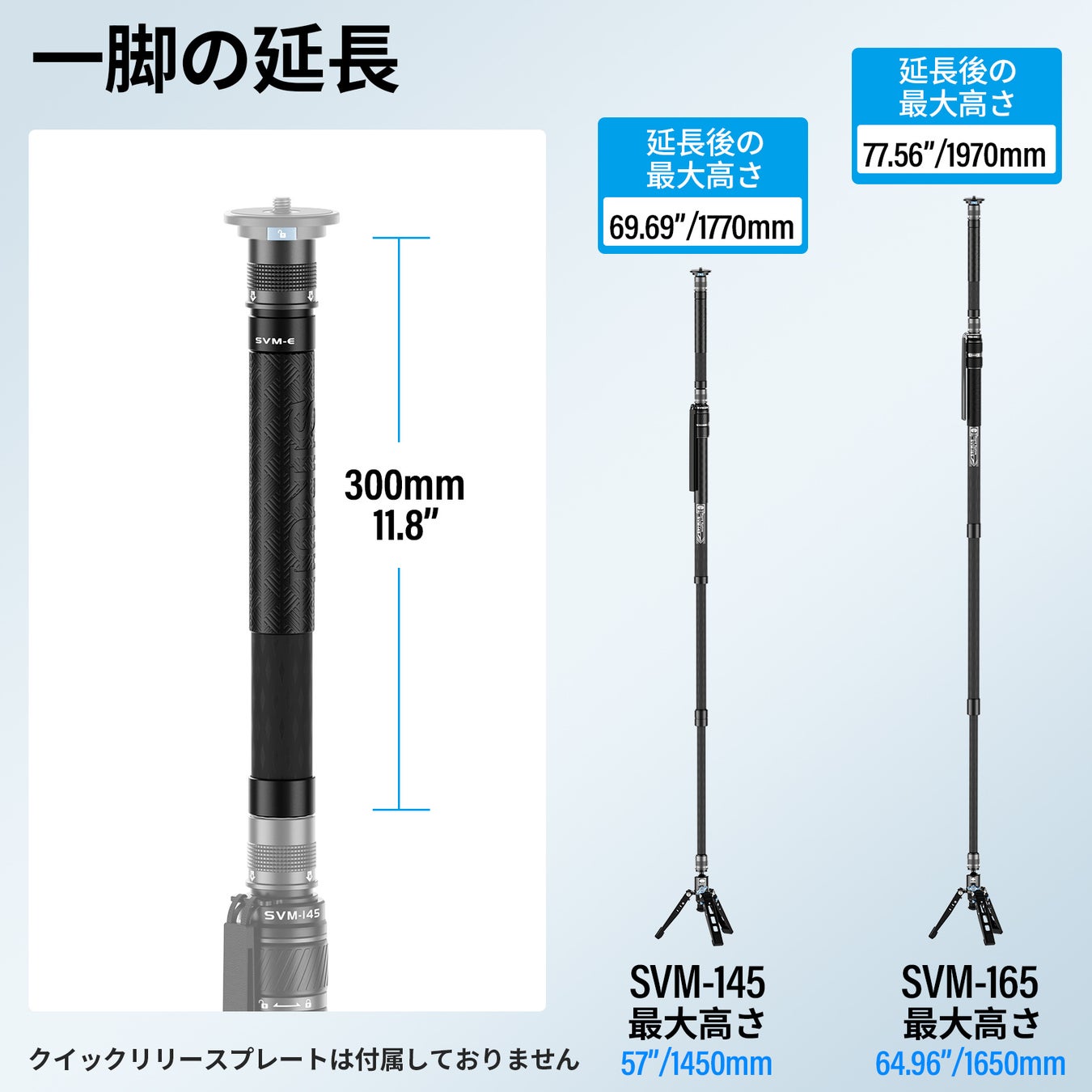 【オプションの延長ロッド】SVM-145 の最大高さは 145cm、SVM165 の最大高さは 165cm です。また、一脚の高さが足りない場合は、オプションの SVM-E 延長ロッドを追加すると、一脚の高さを 30cm 増やすことができます。高度な撮影やカメラクレーンのシミュレーションに最適です。さらに、この延長ロッドはラピッドシステムとうまく連携します。