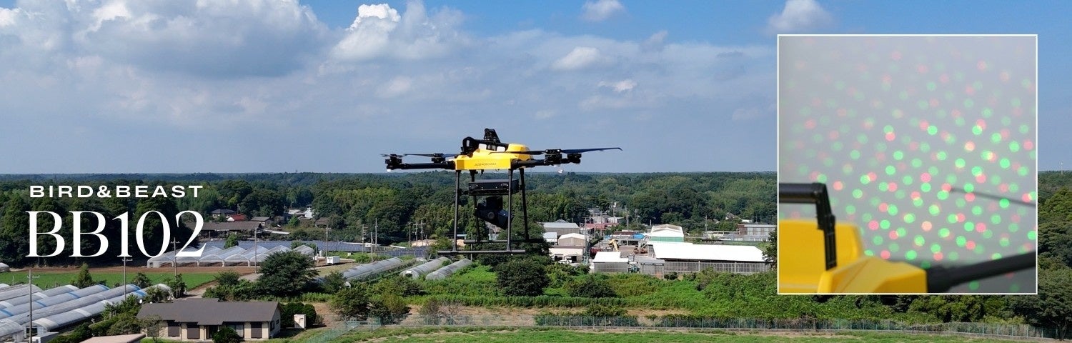 「BB102」は、レーザー照射装置と自動航行機能を備えた鳥獣害対策専用の国産ドローンです。これまで対応が難しかった屋上や高所を含むエリアにおいても、上空から広範囲に対策を行うことが可能です。