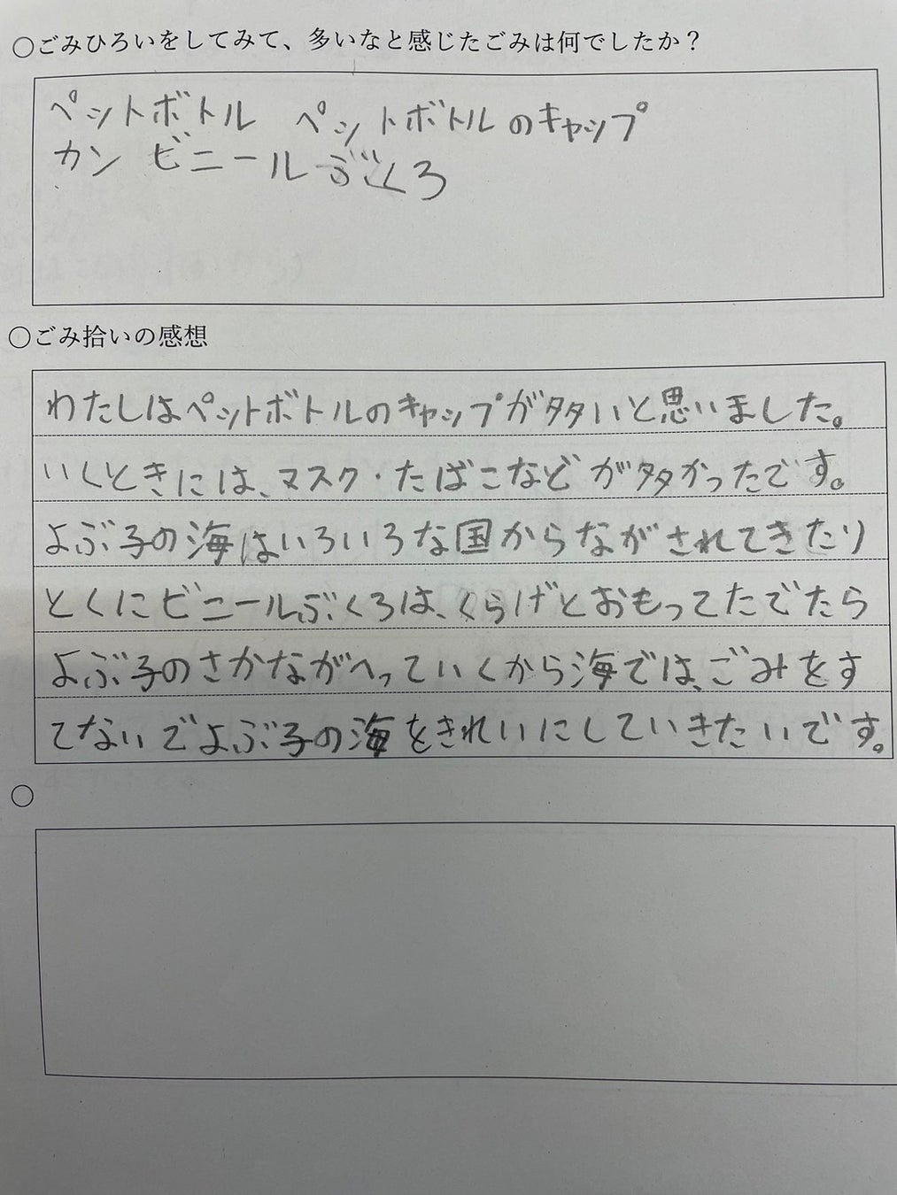 今年のワークショップでは、事前にキャランコビーチでビーチクリーン活動を行った呼子小学校の生徒たちが、環境問題に対する意識を高め、海の豊かさを守るための取り組みについて学びました。少し難しいテーマながら、生徒たちは自分たちの町を守る重要性を真剣に考え、授業に熱心に取り組みました。
