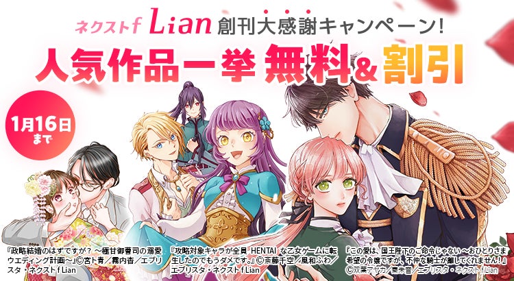 2024年4月23日に創刊した女性向けコミックレーベル「ネクストf Lian」では、創刊大感謝キャンペーンを開催いたします。期間中、『この愛は、国王陛下のご命令じゃない ~おひとりさま希望の令嬢ですが、不仲な騎士が離してくれません!~』や『攻略対象キャラが全員HENTAIな乙女ゲームに転生したのでもうダメです。』等の人気作品や連載中作品も含め、過去最大級の260話以上が無料または割引に!