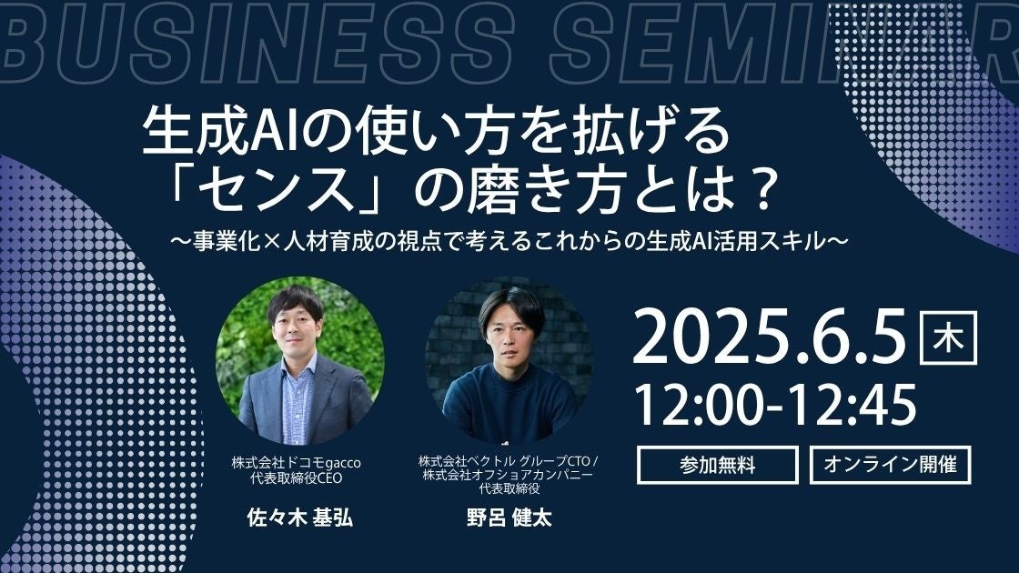 株式会社ベクトル(本社:東京都港区、代表取締役会長兼社長:西江 肇司、東証プライム:6058、以下ベクトル)のグループ会社として、システム開発やAIを活用したSaaS事業を主力事業としてTech領域を担う株式会社オフショアカンパニー(本社:東京都港区、代表取締役:野呂 健太、以下オフショアカンパニー)は、2025年6月5日(木)12:00より開催されるオンラインセミナー「生成AIの使い方を拡げる『センス』の磨き方とは?〜事業化×人材育成の視点で考える これからの生成AI活用スキル〜」に、代表の野呂健太が登壇することをお知らせいたします。
