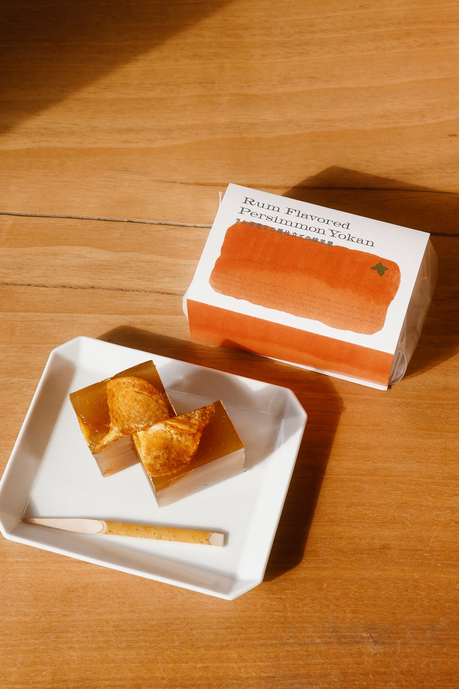 白あんをベースに、ラム酒が香る濃厚な二層仕立ての大人な味わい。干し柿を贅沢に使用したオリジナル羊羹。