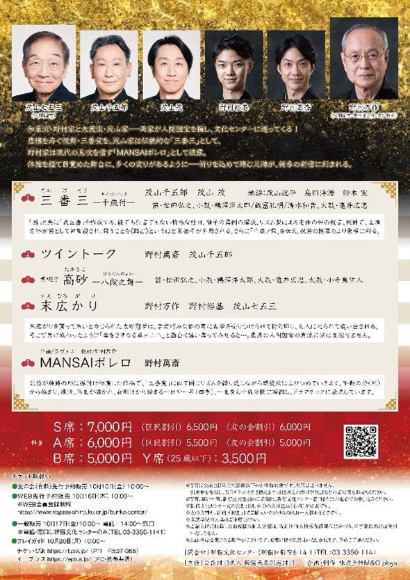 茂山千五郎が究極の伝統として豊穣を寿ぐ祝舞「三番三」を踏み、野村萬斎は現代の息吹を宿す洋楽の独舞「MANSAIボレロ」として舞う。野村万作と茂山七五三、東西の人間国宝による異流共演も見逃せません。