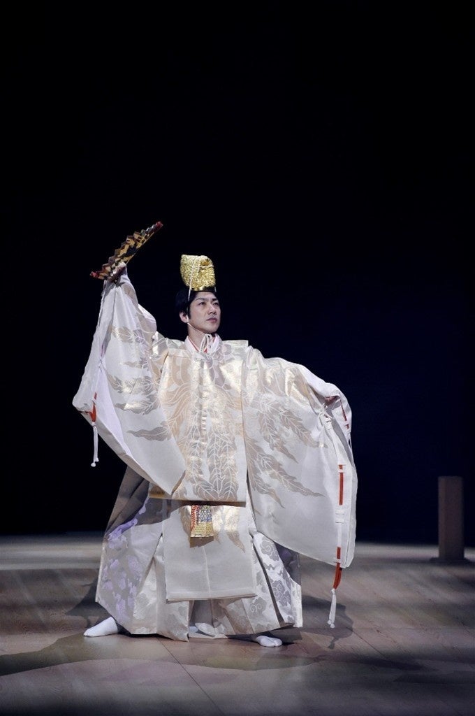 萬斎が独舞の形に振付け初演した作品で、「三番叟」に似て同じリズムを繰り返しながら螺旋状に上りつめていきます。不動の静(死)から始まり、復活、再生が描かれ、夜明けから始まる一日や一年(四季)、一生をも十数分間に凝縮し、ドラマチックに表現しています。