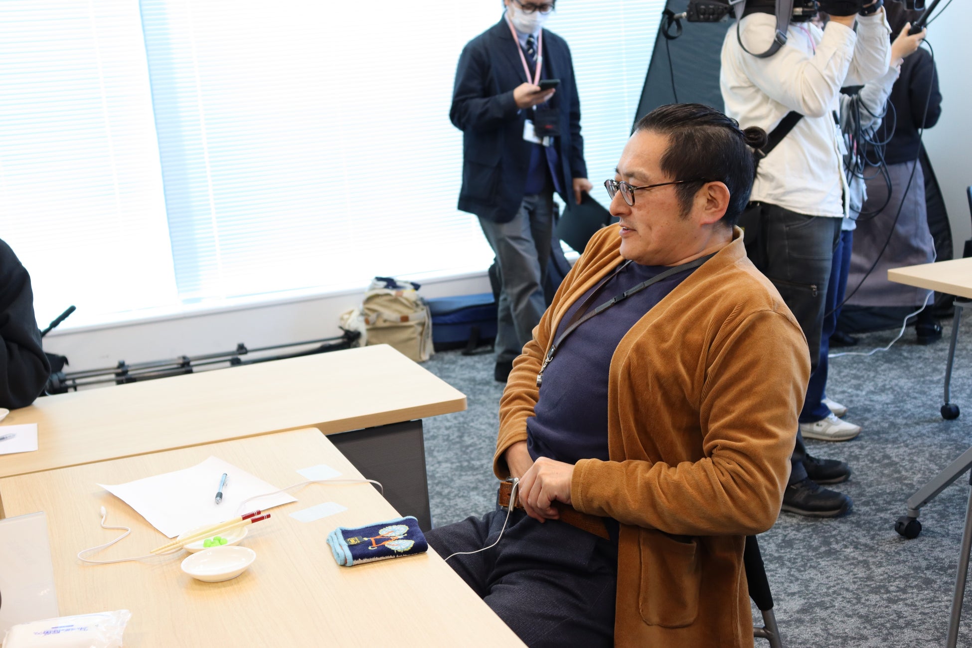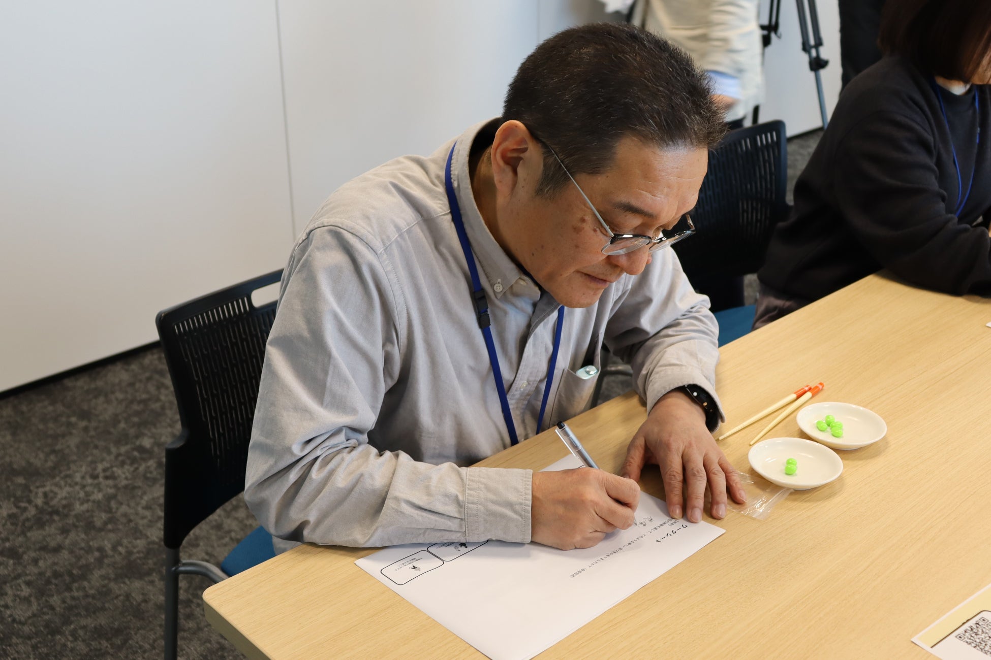 電気治療などで使われているEMS機器を使用し、生理痛を疑似体験しました。痛みの波を体験すべく、弱と強の2段階を体験しながら、箸で豆を移動させる細かい作業と文章の要約ワークを行い、痛みを伴いながらの作業に苦戦している社員もいました。