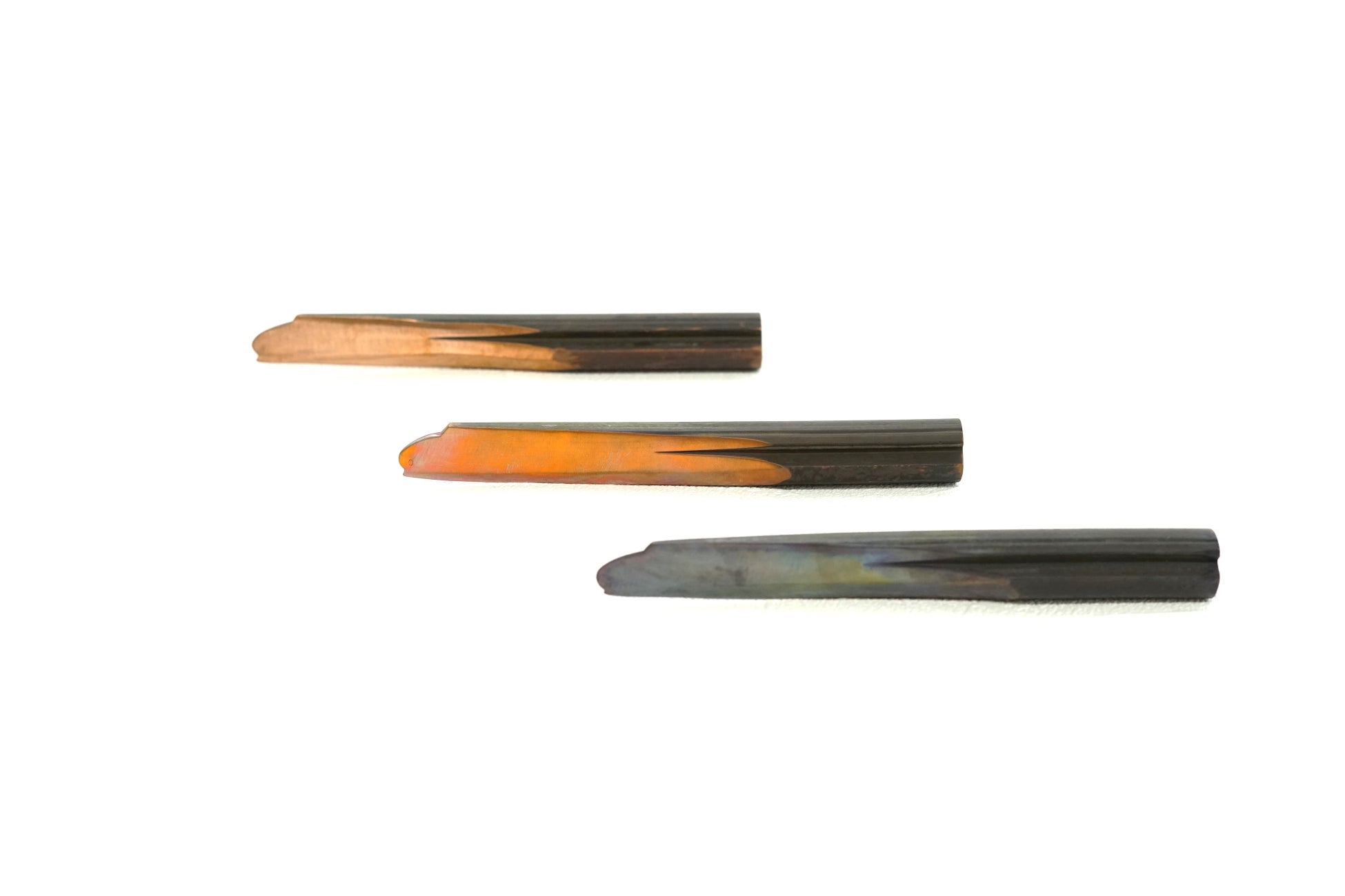 銅板を硫化カリウム水溶液で硫化被膜を表面に張り、銅を漆黒に染色しています。火から生まれるのが「炎」ならば、水から生まれるのが「染」。落ち着きのある風合から育てはじめる、「通」好みな仕上げです。
